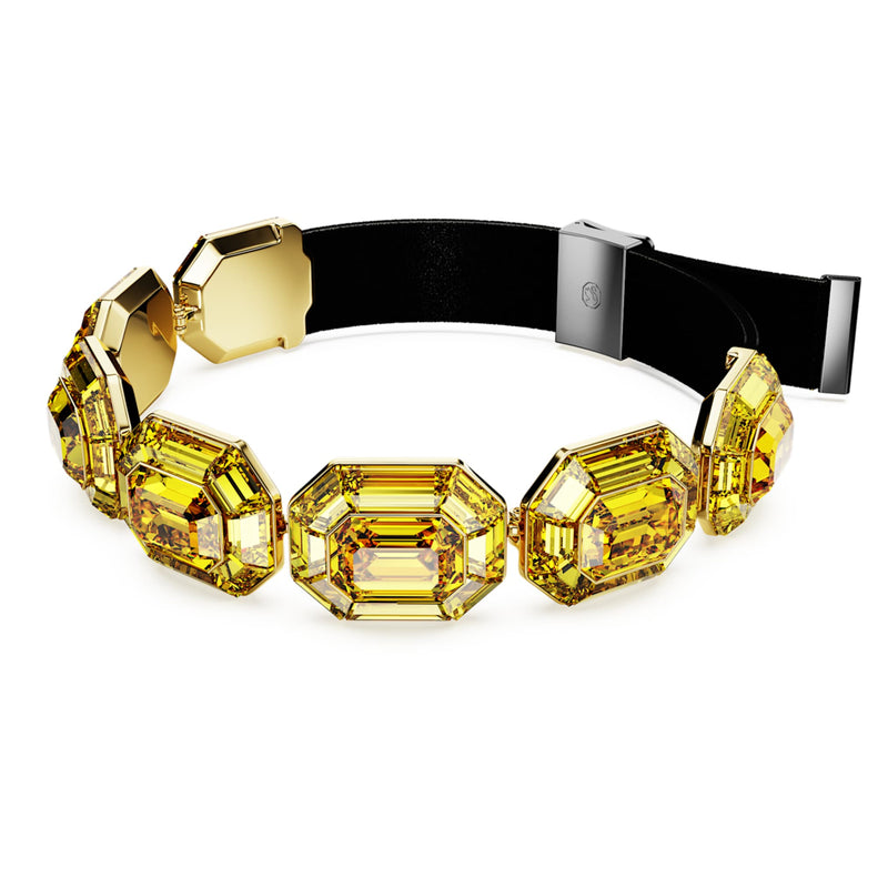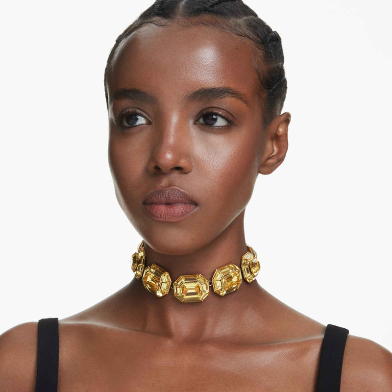 El estilo llamativo nunca había brillado tanto. Esta impresionante gargantilla Lucent se presenta con grandes cristales amarillos sobre una correa de terciopelo negro; cada cristal está tallado con la emblemática forma octogonal de Swarovski para crear una atrevida expresión de color y luz. Combina esta gargantilla con los accesorios amarillos a juego de Lucent para brillar como el sol o envuélvela para hacer un regalo brillante.