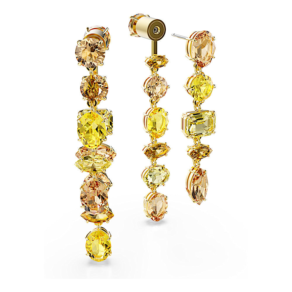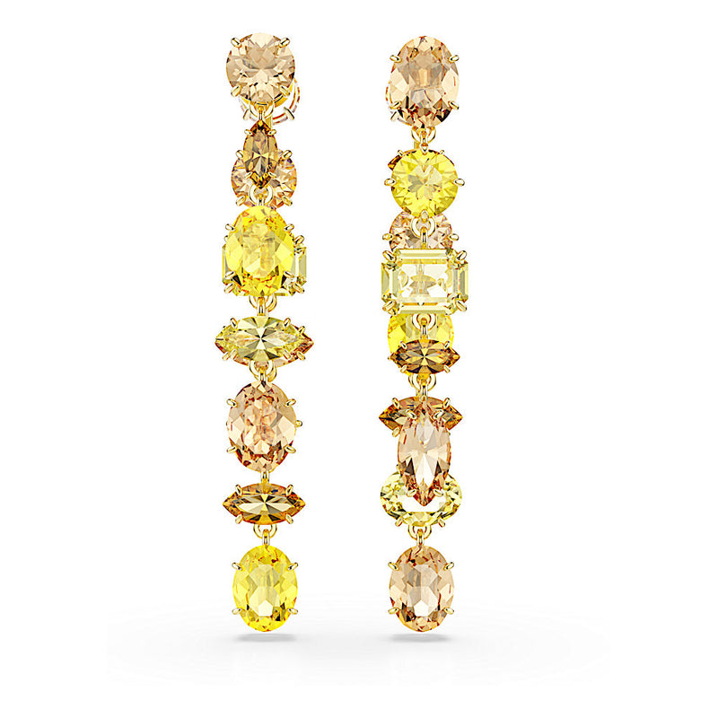 Estos expresivos pendientes están diseñados para potenciar la energía y el buen humor. Cada pieza, bañada en tono oro, presenta dos hileras asimétricas adornadas con una mezcla de cristales en engaste de garra de diversas tallas y tonos amarillos y ámbar. Son un emblema de las inesperadas formaciones y la vibrante belleza de Gema, y brillan aún más cuando se combinan con otros accesorios a juego de la misma familia.