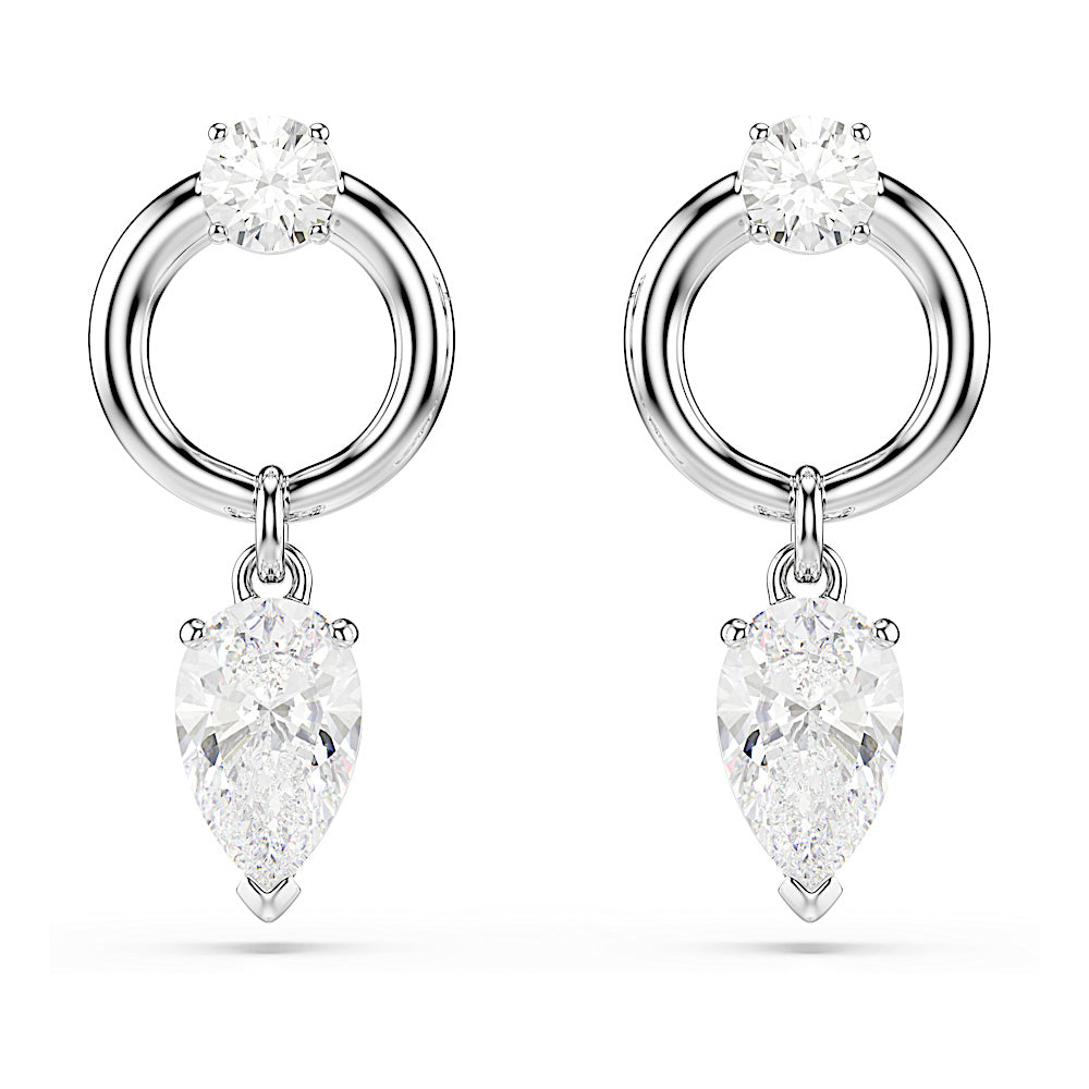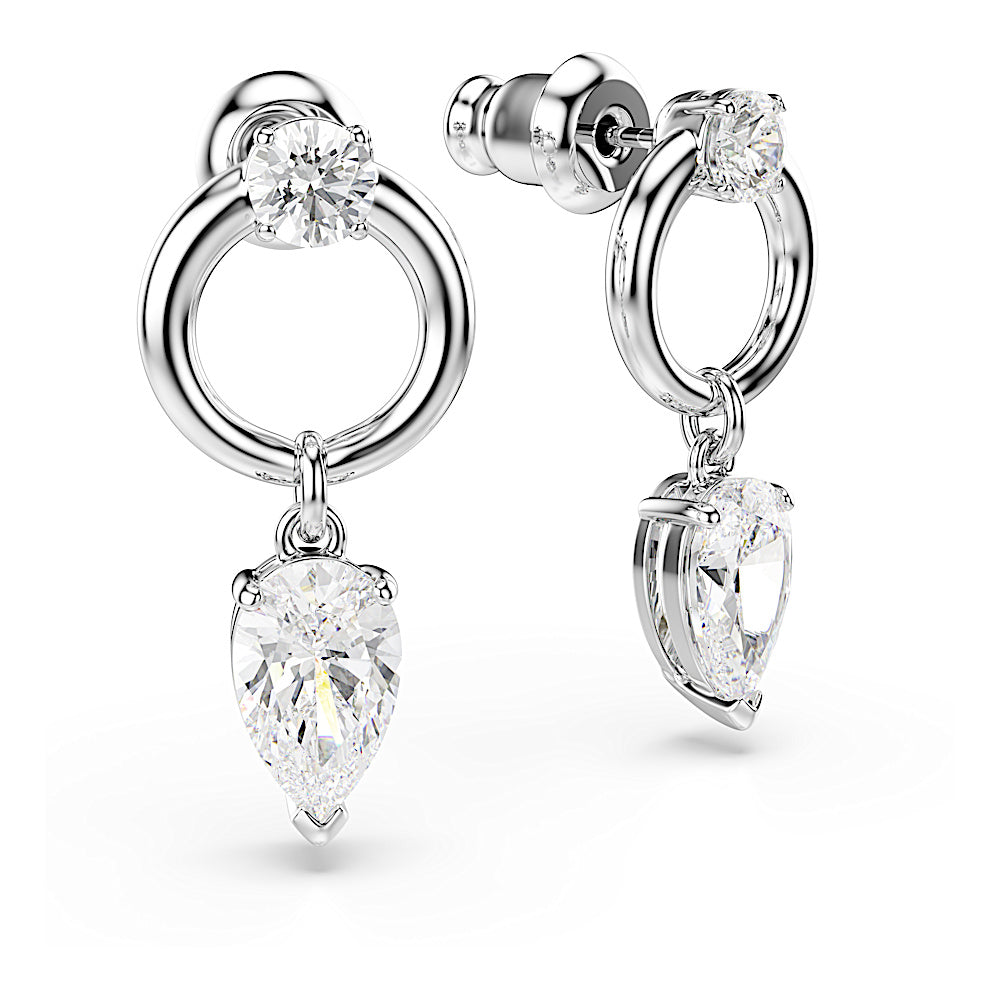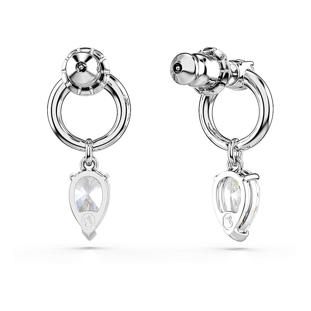 Capta la luz desde todos los ángulos con estos pendientes Mesmera únicos. Cada brillante motivo presenta una Swarovski Zirconia en talla de pera, unida a un lujoso aro bañado en rodio. También se ha colocado una Swarovski Zirconia adicional de talla redonda en el centro. Llévalos junto con el colgante a juego para crear tu propio conjunto deslumbrante.